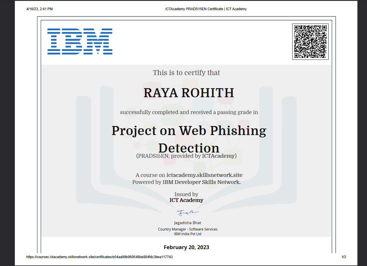 Project overview: Created a Flask-based phishing detection system that classified suspicious URLs using Scikit-learn models. Frontend built in HTML/CSS; deployed on IBM Watson Studio with secure cloud storage integration.